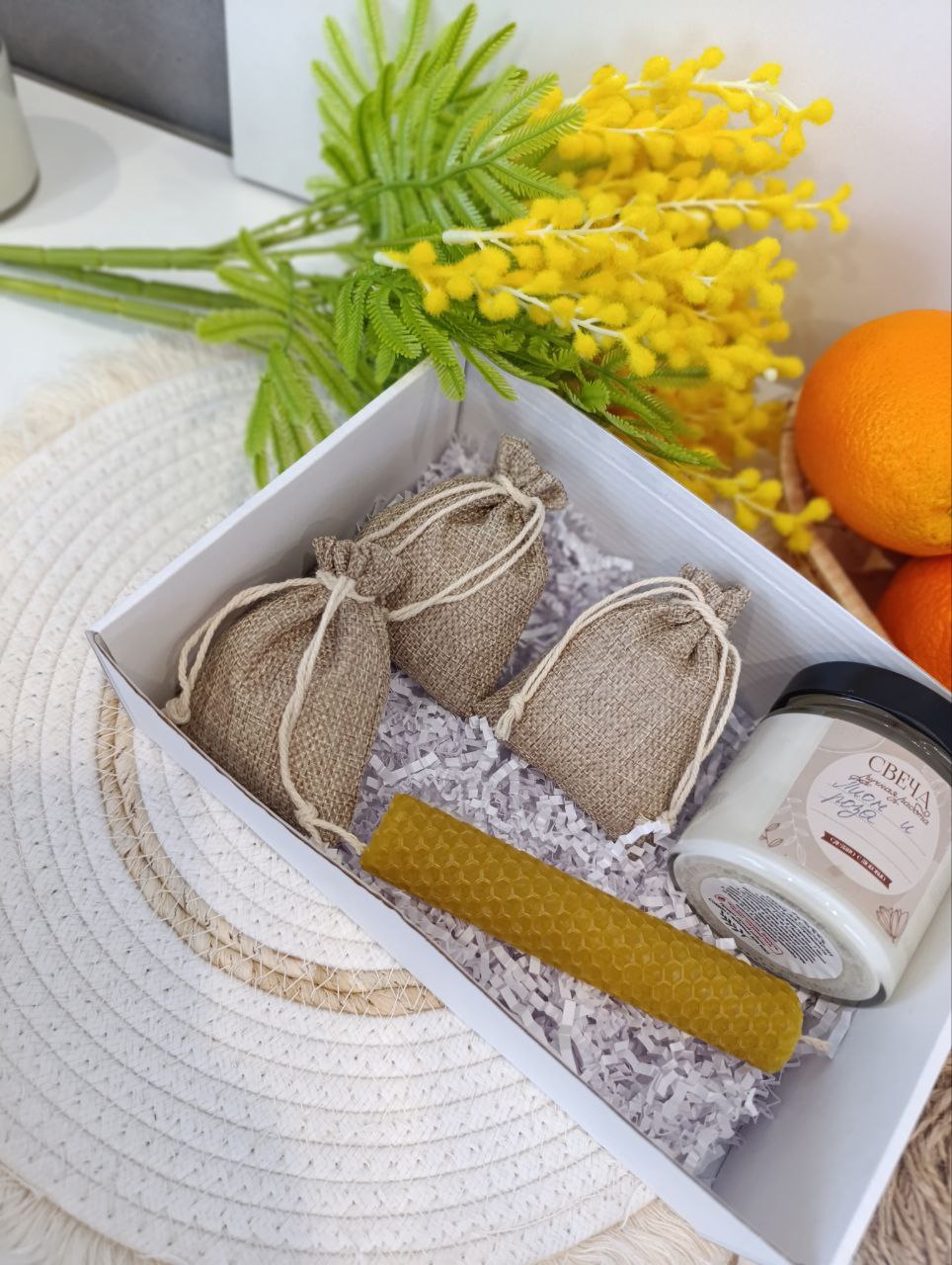 - 🕯️ Ароматическая свеча: создает легкую фоновую атмосферу праздника и уюта.